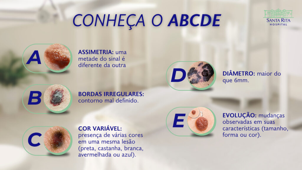 A campanha Dezembro Laranja reforça a importância de observar a própria pele. Temos uma regra mundialmente conhecida: a regra do ABCDE*. Toda pessoa consegue fazer o autoexame observando que cada letra se refere a um ponto de atenção para identificar a doença: